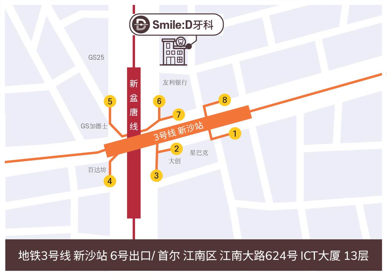 地址:首尔 江南区 江南大路 624,ICT大楼 13楼 SmileD牙科